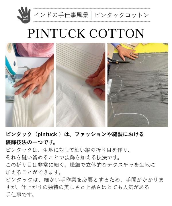 繊細なピンタックとやわらかなコットンキャンブリック素材が魅力のシャツワンピース。 インドの職人による丁寧な手仕事で施されたピンタックは、手仕事ならではの美しさと上品さを感じさせる仕上がりです。